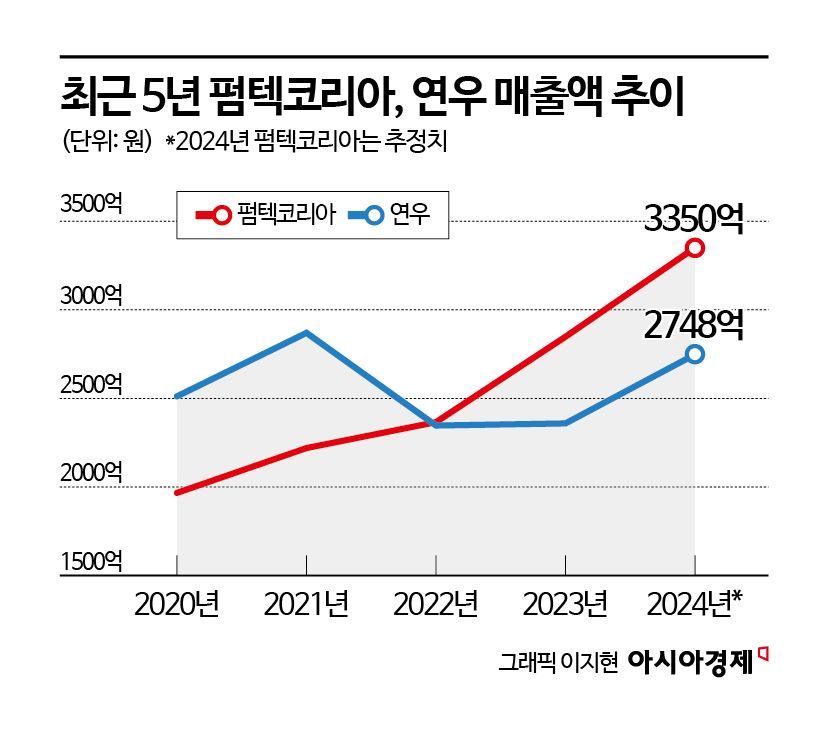 국내 용기 시장 점유율 1위 업체인펌텍코리아의 매출 성장세는 더 가파르다. 펌텍코리아의 지난해 매출액과 영업이익은 각각 3350억원, 479억원으로 전년동기대비 17%와 36% 신장한 것으로 추산된다. 2001년 회사 설립 이후 사상 최대 매출액이다. 펌텍코리아는 2020년만 하더라도 매출액은 2000억원대에 미치지 못했지만, 지난해에는 매출 3000억원을 돌파한 것으로 예측된다.