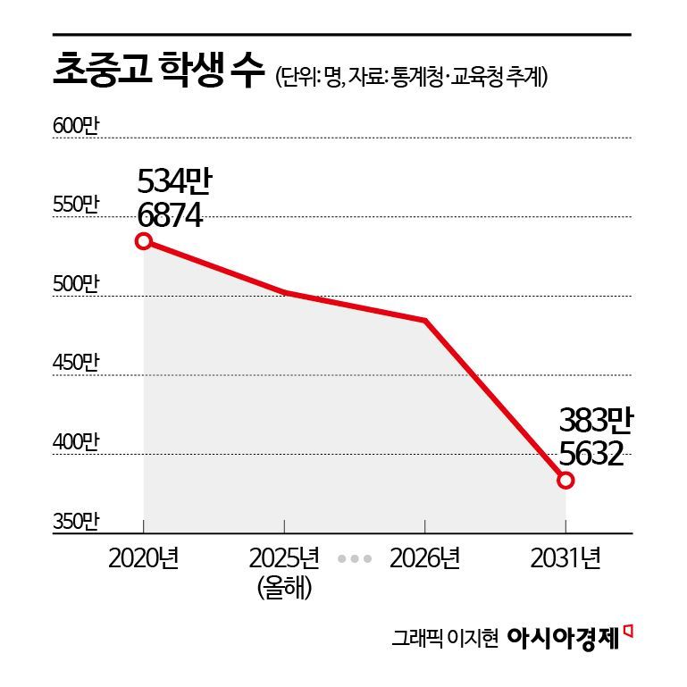 반등은 쉽지 않을 전망이다. 학년이 낮을수록 학생 수는 더 적어지기 때문이다. 내년 초등학교 1학년(30만92명)은 6학년(42만2129명)보다 12만명 적고, 2031년에도 7만5000명 차이가 난다.
