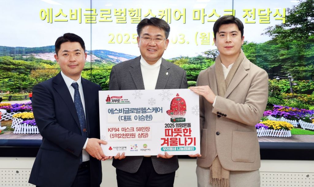 이번 기부에는 에스비글로벌헬스케어(대표 이승현)와 아이바나리(대표 이승훈)가 참여해 총 5억4400만 원 상당의 성품을 전달했다. 에스비글로벌헬스케어는 KF94 마스크 58만 장(5억2000만 원 상당)을, 아이바나리는 비건 인증 마스크팩 8000장(2400만 원 상당)을 기부하며 지역사회 나눔에 동참했다.