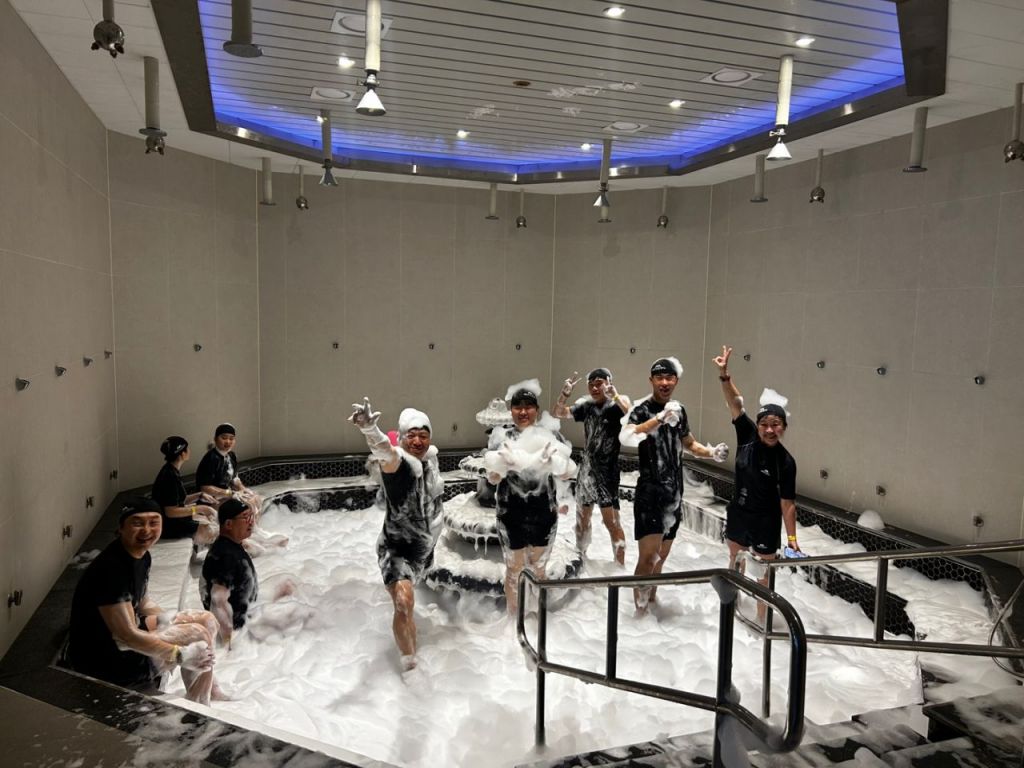 완도해양치유센터를 방문한 대만 관광객들이 해조류 거품을 체험하고 있다. 완도군 제공