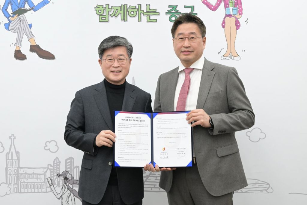 서울 중구와 호텔신라가 취약계층 지원을 위한 ‘위기상황 해소 프로젝트’ 협약을 맺었다. 사진 왼쪽 김길성 중구청장, 오른쪽은 김준환 호텔신라 부사장. 중구 제공.
