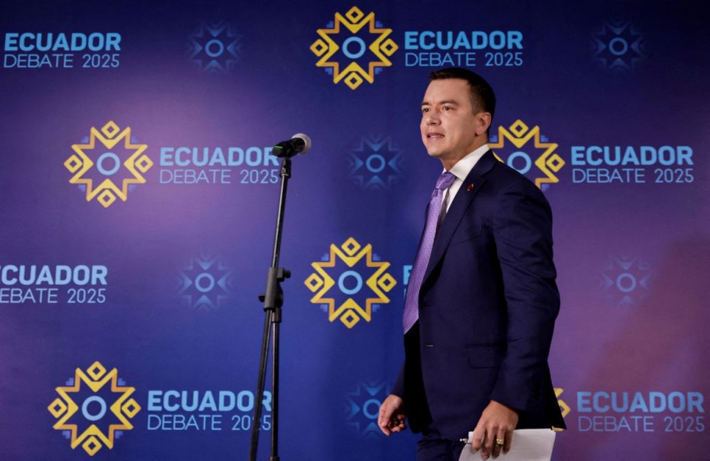 다니엘 노보아 에콰도르 대통령이 3일(현지시간) "에콰도르 생산자들에게 공정한 대우를 보장하기 위해 멕시코산 제품에 27% 관세를 부과한다"고 발표했다. 사진은 재선에 도전한 노보아 대통령이 지난달 19일 텔레비전 대선 토론 프로그램에 참석하고 있는 모습. /로이터·연합 로이터연합뉴스