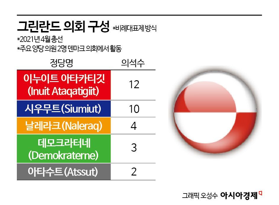 현재 그린란드 의회(총 31명)는 2021년 선거에서 승리한 제1정당 IA가 12석을 차지하고 있다. 당시 선거에서 10석을 배정받은 시우무트(Siumut)와 IA는 연립 정부를 구성했다. 이 밖에도 군소정당 날레라크(Naleraq) 4석, 데모크라터네(Demokraterne) 3석, 아타수트(Atssut) 2석을 갖고 있다. 그린란드는 4년마다 비례대표 선출 방식으로 의원을 선출한다.