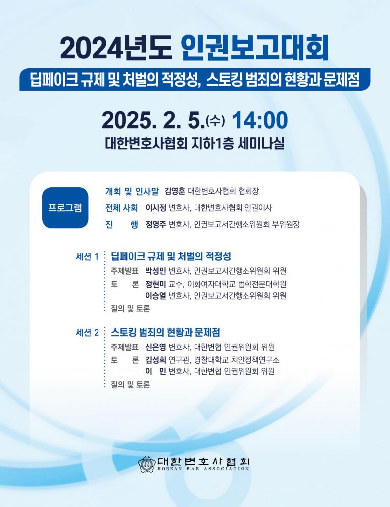 이번 인권보고대회는 2개 세션으로 나뉘고, 세션 사회는 정영주 변호사(대한변협 인권보고서 간행소위원회 부위원장)가 맡는다. 전체 사회는 이시정 대한변협 제2인권이사가 진행할 예정이다. 첫 번째 세션은 '딥페이크 규제 및 처벌의 적정성'을 주제로 박성민 변호사(대한 변협 인권보고서간행소위원회 위원)가 딥페이크와 관련한 사례 소개와 법제의 현황과 헌법상 표현의 자유 침해 및 보장에 대한 인권적 측면을 살펴본다. 정현미 이화여대 법학전문대학원 교수와 이승열 변호사(대한변협 인권보고서간행소위원회 위원)가 토론자로 참여한다.