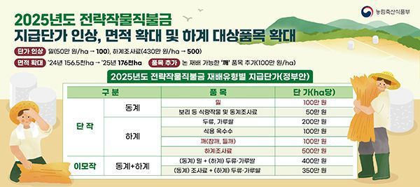 올해 달라진 점은 하계작물로 깨(들깨, 참깨)가 새롭게 추가됐고, 밀(동계)의 직불금 단가가 기존 50만원에서 100만원으로, 조사료(하계)는 430만원에서 500만원으로 인상됐다.