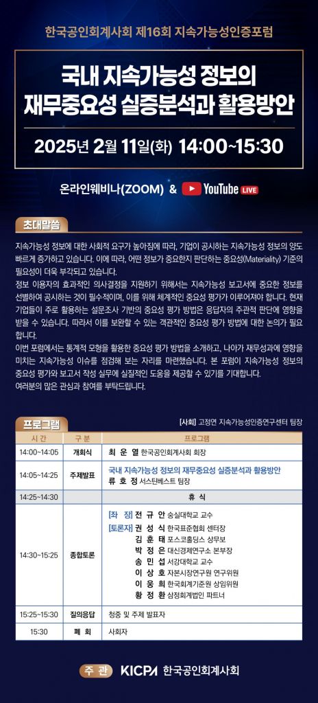 한국공인회계사회가 국내 지속가능성 정보의 재무 중요성을 분석하고 활용하는 방안을 논의하는 행사를 연다.