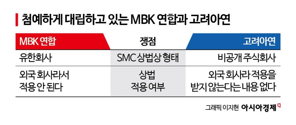 가처분 소송의 또 다른 쟁점은 외국법인인 SMC가 우리 상법의 적용을 받느냐이다. MBK 연합 측은 SMC가 호주법에 따라 설립된 해외법인이기 때문에 우리 상법을 적용할 수 없고, 특히 상호주 의결권 제한 규정도 적용될 수 없다고 주장하고 있다. 반면 고려아연 측은 "국내 기업의 해외 자회사가 상법 369조 3항의 적용을 받지 않는다는 내용이 없다"고 맞서고 있다.