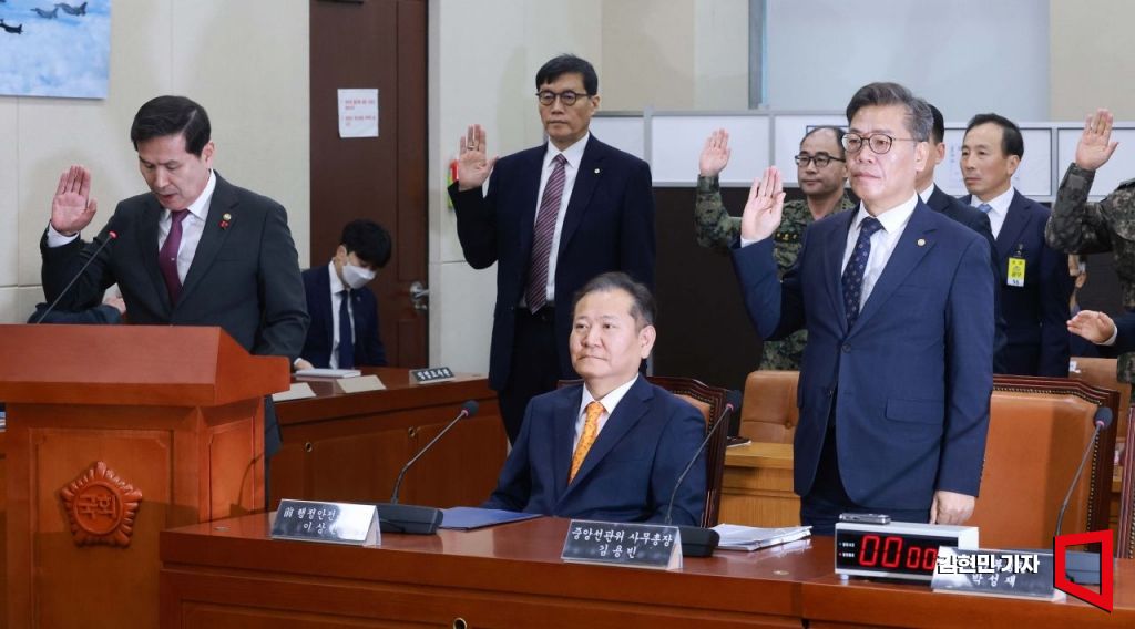 이상민 전 행정안전부 장관이 4일 국회에서 열린 윤석열 정부의 비상계엄 선포를 통한 내란 혐의 진상규명 국정조사 특별위원회에서 증인선서를 거부한 채 자리에 앉아 있다.