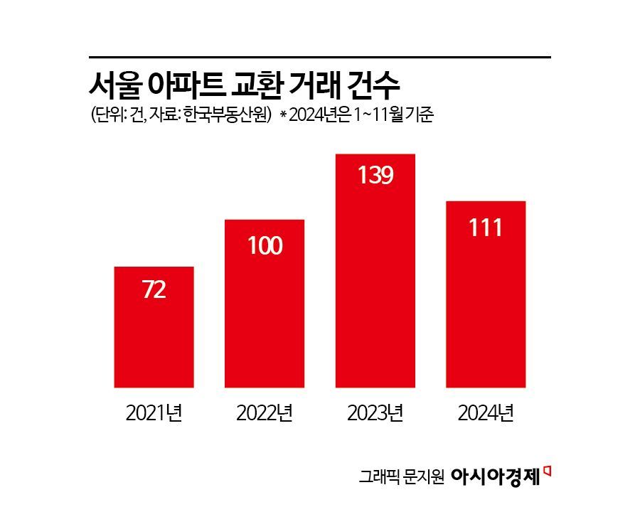 5일 한국부동산원 통계에 따르면 지난해 1~11월까지 서울 아파트 교환 거래 건수는 총 111건으로 파악됐다. 전년 같은 기간에는 131건이 집계됐는데 20건이 줄었다. 전년 전체는 139건으로, 28건이 감소했다.