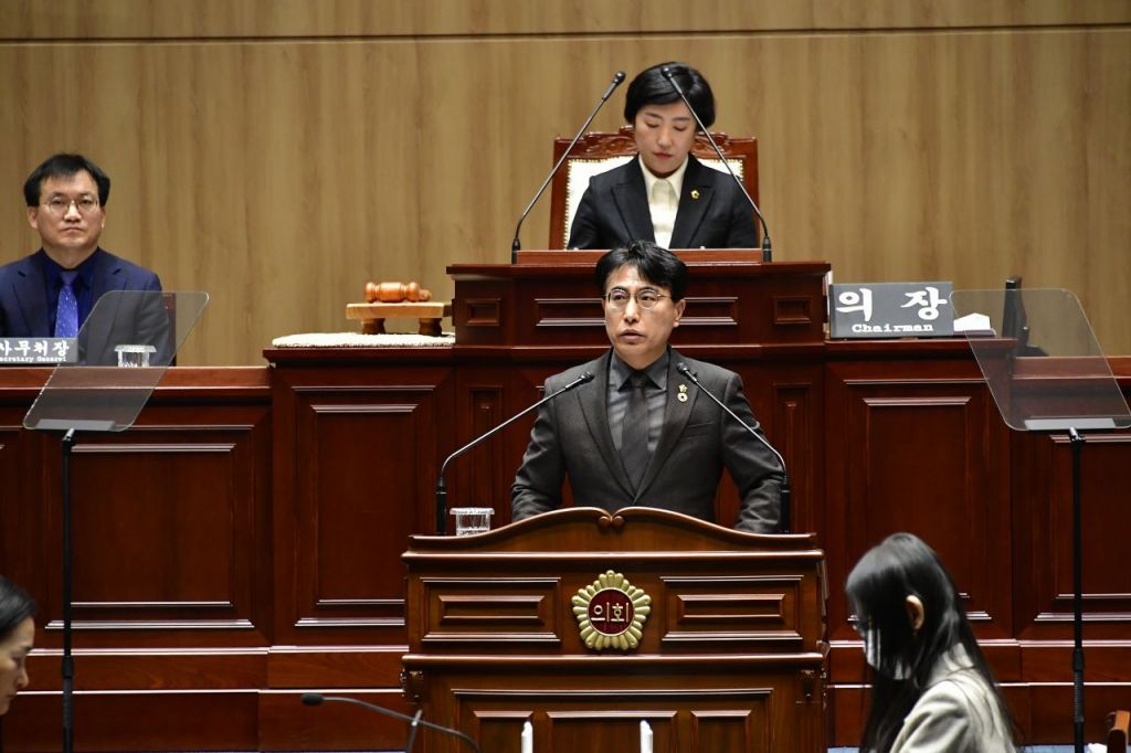 박필순 광주시의회 의원이 4일 열린 제330회 임시회 제1차 본회의에서 ‘5분 발언’을 하고 있다. 광주시의회 제공