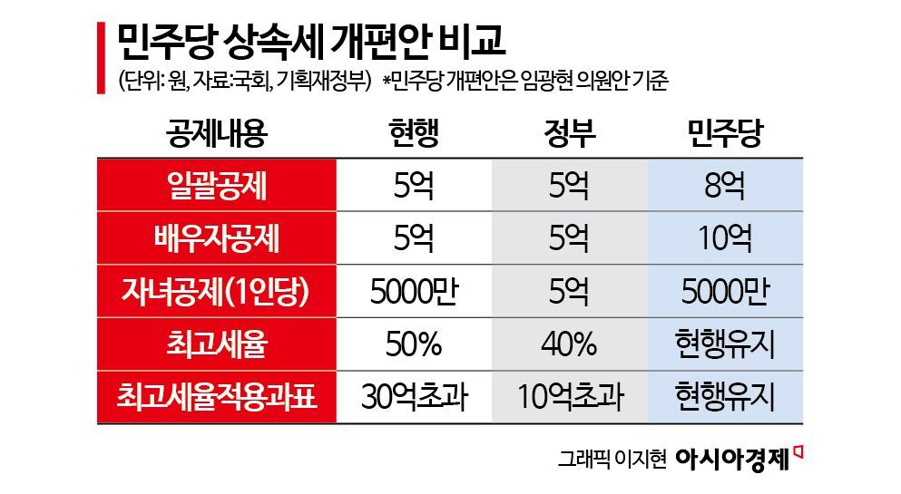 민주당의 상속세 개편 작업은 원내부대표인 임광현 의원이 주도하고 있다. 당에서 추진하는 상속세 개편안의 핵심은 공제 최저한도를 최대 8억원 상향하는 데 있다. 구체적으로 일괄공제액을 현행 5억원에서 8억원, 배우자 상속공제 최저한도는 현행 5억원에서 10억원으로 각각 높이는 것이다. 예컨대 현행법에 따르면 상속 재산이 10억원(5억원+5억원) 이하인 경우 세금 면제 대상이지만, 민주당이 추진하는 개정안이 통과하면 최대 18억원(8억원+10억원) 이하까지 세금이 면제되는 셈이다.