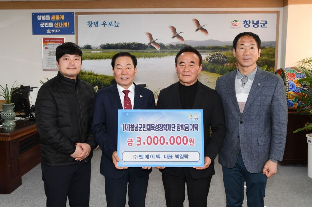 경남 창녕군은 엔에이텍 박장락 대표가 창녕군인재육성장학재단에 지역의 인재 육성을 위해 장학금 300만원을 기탁했다고 5일 밝혔다.