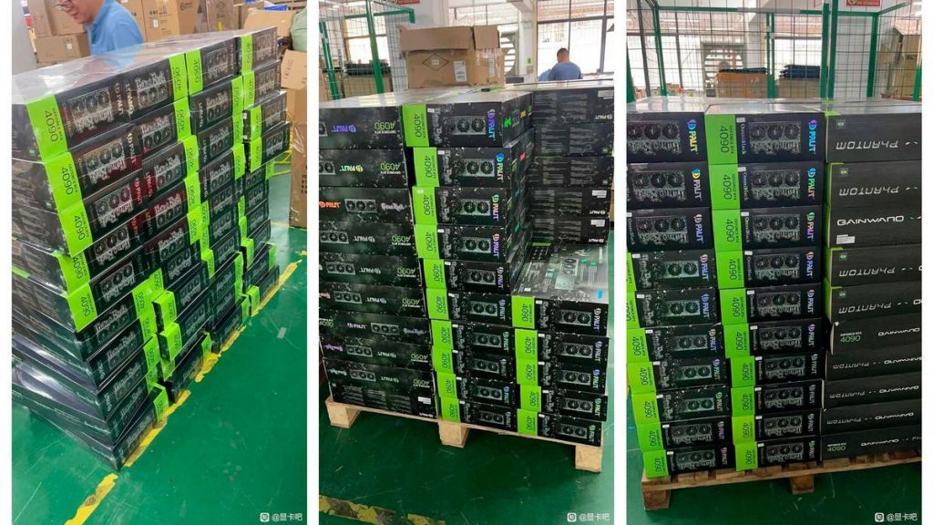 대중 반도체 제재가 시작된 2023년 말 당시 중국의 한 물류센터에 게임용 GPU가 가득 쌓여 있는 모습. 바이두 캡처