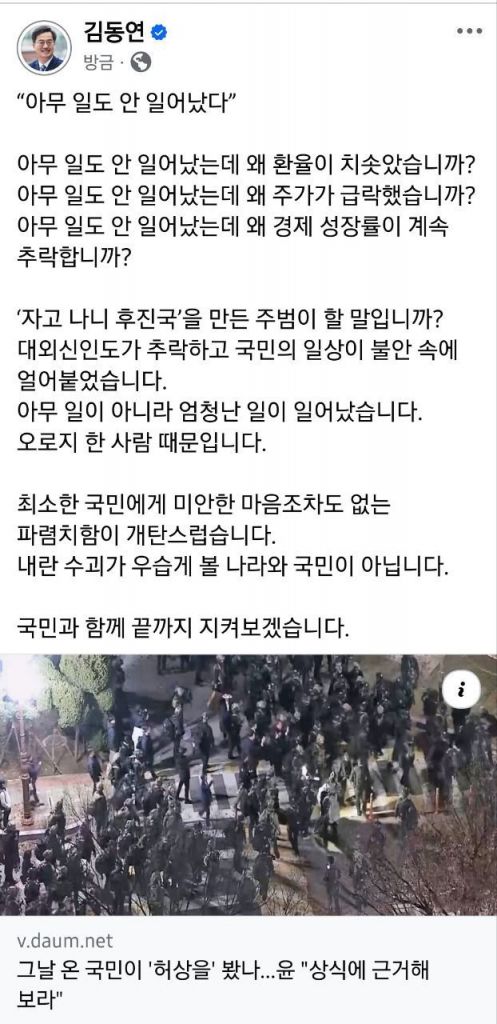 김동연 지사는 5일 자신의 사회관계망서비스(SNS)에 올린 글에서 "(윤 대통령이) ‘아무 일도 안 일어났다’고 했다"며 "아무 일도 안 일어났는데 왜 환율이 치솟았습니까, 아무 일도 안 일어났는데 왜 주가가 급락했습니까, 아무 일도 안 일어났는데 왜 경제 성장률이 계속 추락합니까"라고 반문했다.