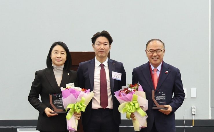 충남 서산시의회 조동식 의장과 한석화 의원이 4일 서산 베니키아호텔에서 열린 서산시소상공인연합회 2025년 정기총회에서 감사패를 받았다. 사진 왼쪽부터 한석화 의원, 김문익 회장, 조동식 의장. /서산시의회