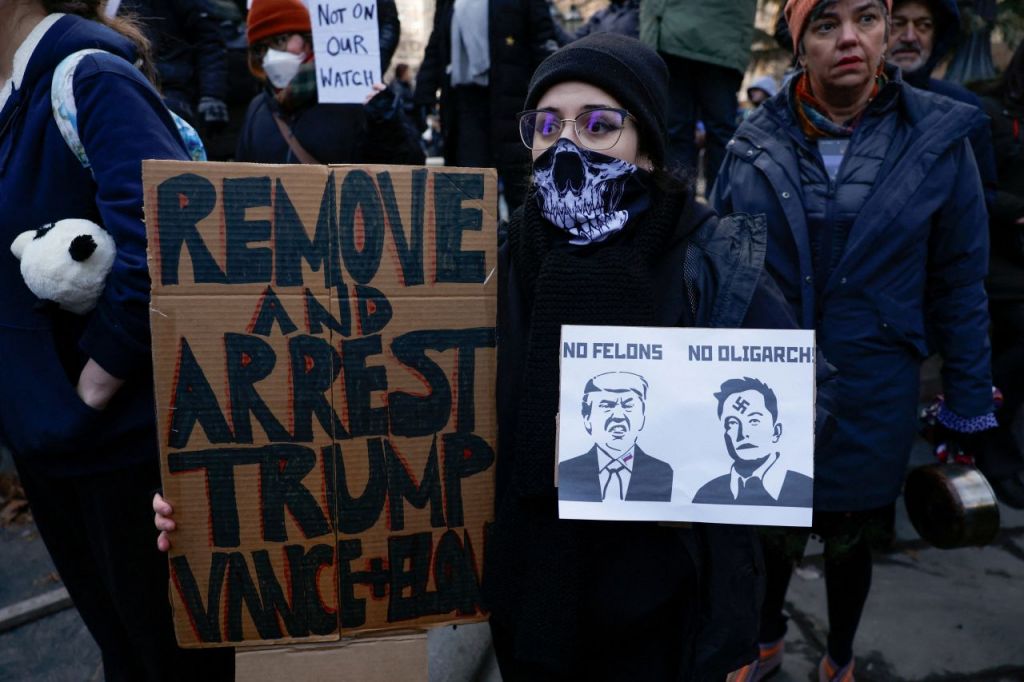 트럼프 행정부의 연방개혁에 반발한 시위자들이 "연방공무원들이 꿋꿋하게 있어달라"는 피켓을 들어보이고 있다. AFP·게티이미지=연합뉴스