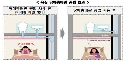 LH는 올해부터 공공임대주택에 ‘욕실 당해층배관 공법’을 전면 적용한다. 이 공법은 욕실 벽면에 해당층의 오·배수배관을 설치하는 방식으로, 세대 내에서 배출되는 용수가 아래층으로 내려가지 않고, 세대 내에서 직접 배출되어 배수소음을 최소화한다. 한국건설기술연구원의 실험에 따르면 이 공법을 사용하면 배수소음이 기존 46dB에서 38dB로 대폭 저감된다. 공부방 정도의 정숙성을 확보할 수 있다.