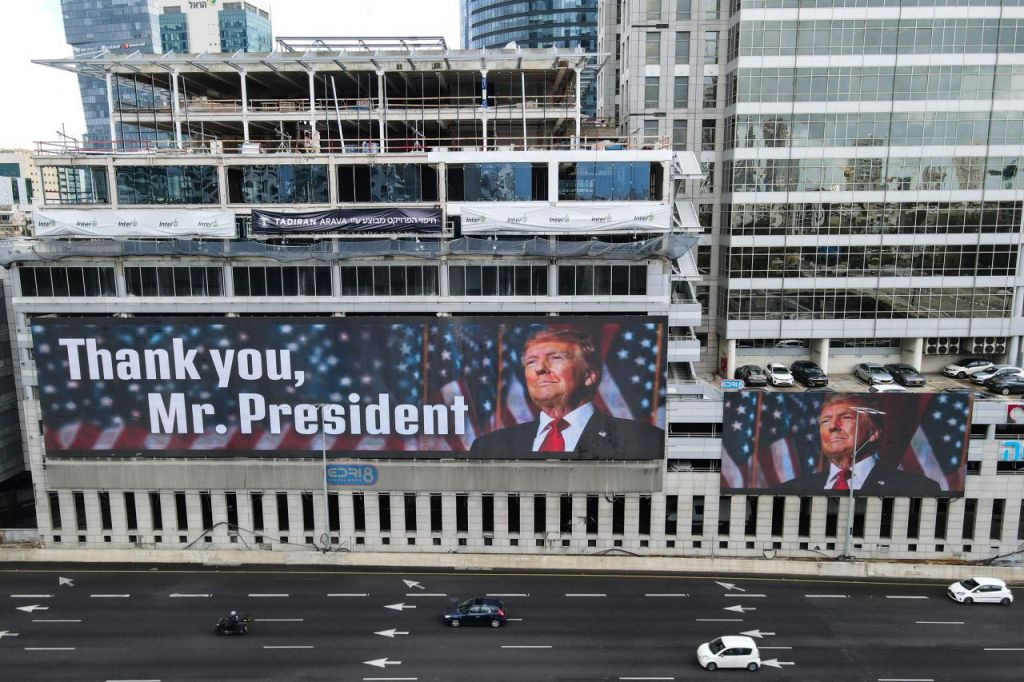 5일(현지시간) 이스라엘 텔아비브 호텔 정면에 도널드 트럼프 미국 대통령에게 감사한다는 내용의 옥외광고물이 설치된 모습. 트럼프 대통령이 가자지구를 미국이 직접 점령, 관광지로 개발하겠다는 발언 이후 이스라엘 극우세력들을 중심으로 이를 환영하는 광고물이 게재되고 있다. AFP·연합뉴스