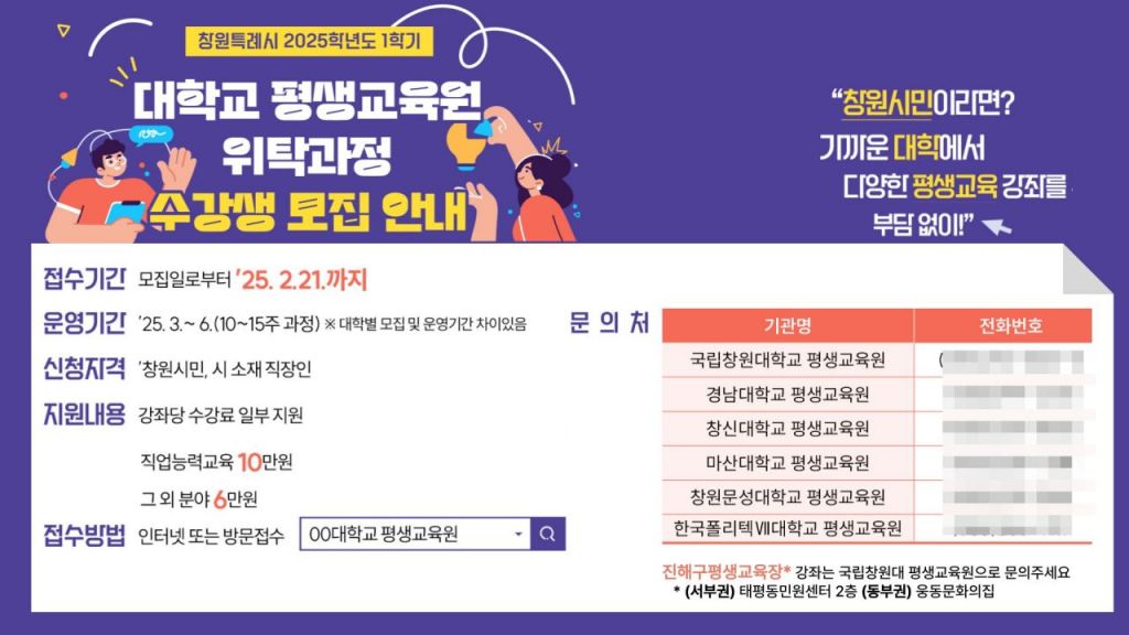 대학교 평생교육원 위탁과정은 창원시가 지역 대학과 협력해 시민들에게 다양한 학습 기회를 제공하기 위해 운영하는 사업이다. 국립창원대학교, 경남대학교, 창신대학교, 창원문성대학교, 마산대학교, 한국폴리텍Ⅶ대학 등 관내 6개 대학의 평생교육원이 참여하며, 지역민의 교육 수요에 맞춘 다양한 강좌가 개설될 예정이다.