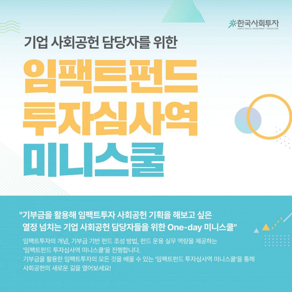 한국사회투자는 기업 사회공헌 담당자를 위한 '임팩트펀드 투자심사역 미니스쿨'을 개최한다.