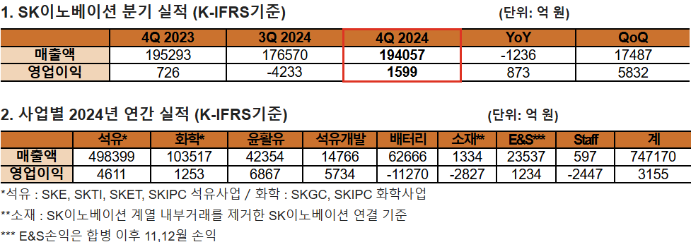 소재사업은 판매 물량 증가에도 불구하고, 재고 관련 등 일회성 비용 발생 등의 영향으로 영업적자를 기록했으며, SK이노베이션 E&S사업은 계절적 변동에 따른 전력수요 감소 등으로 전력시장가격(SMP) 하락해 전분기 대비 영업이익이 감소한 것으로 회사 측은 설명했다.