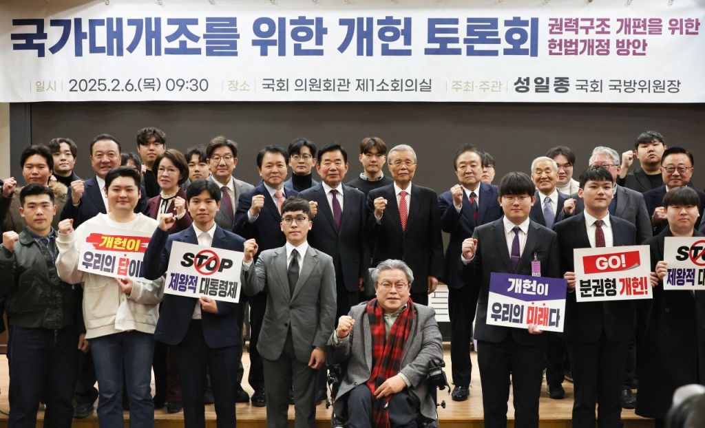 6일 성일종 국민의힘 의원은 국회에서 ‘국가 대개조를 위한 개헌 토론회’를 열었다. 이 자리에는 권영세 국민의힘 비상대책위원장, 권성동 국민의힘 원내대표 등 당 지도부가 참석했다. 아울러 김종인 전 국민의힘 비대위원장, 김진표 전 국회의장, 정대철 헌정회장, 이재오 민주화운동기념사업회 이사장 등 정치 원로들이 대거 자리했다.
