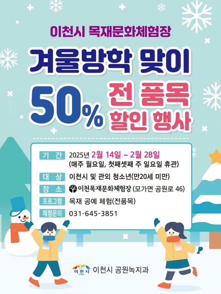경기도 이천시는 겨울방학을 맞아 어린이와 청소년의 현장 체험 기회를 확대하기 위해 목재문화체험장 이용료를 50% 할인한다.