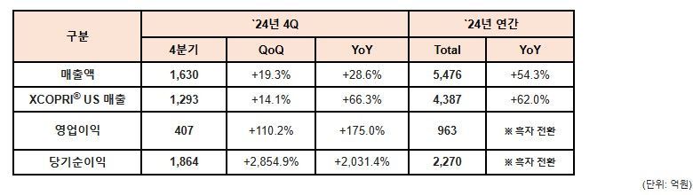 뇌전증 의약품인 세노바메이트의 미국 내 매출은 약 4387억원으로 지난해 대비 62.0% 성장하며 지난해 제시한 가이던스(목표치)의 상단을 넘어선 견조한 성장을 기록했다.