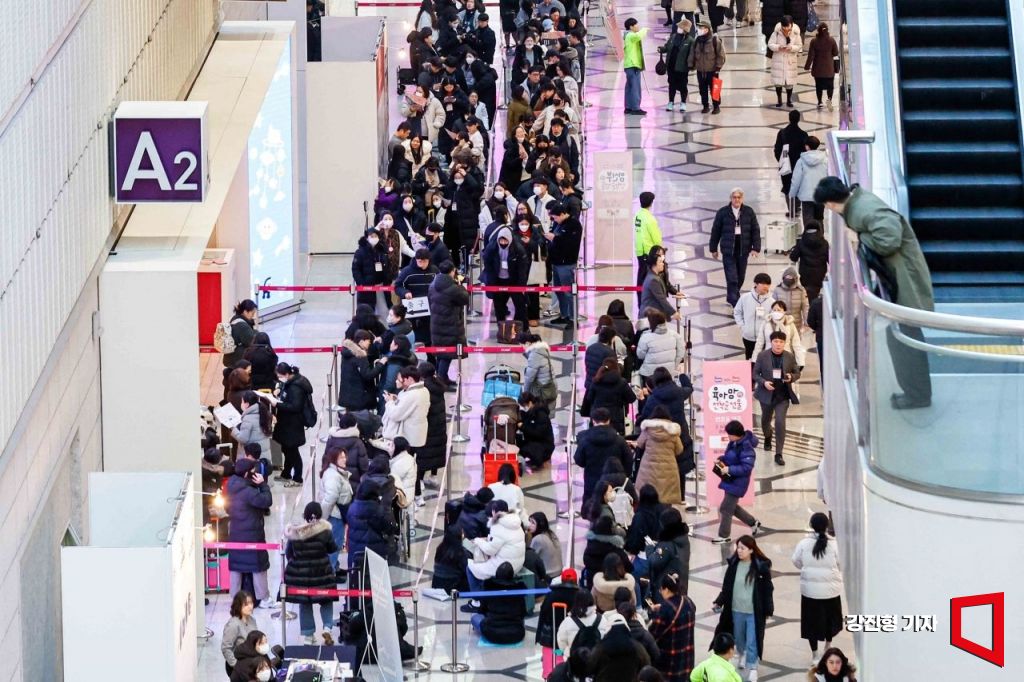 6일 서울 강남구 코엑스에서 열린 '제47회 베페 베이비페어'를 찾은 관람객들이 입장하기 위해 줄을 서고 있다.