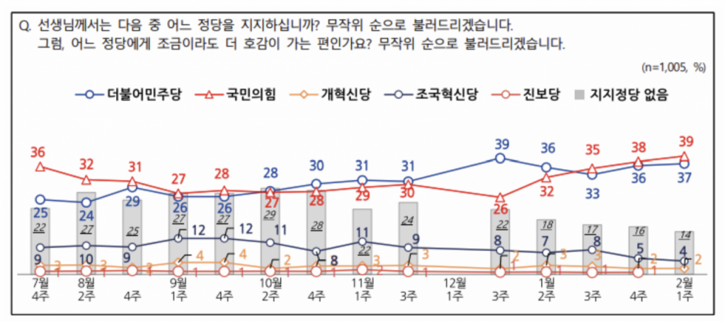 6일 엠브레인퍼블릭·케이스탯리서치·코리아리서치·한국리서치의 전국지표조사(NBS, 3~5일 전국 18세 이상 남녀 1005명을 대상으로 휴대전화 전화 면접 방식으로 진행, 표본오차는 95% 신뢰수준에 ± 3.1%포인트, 응답률은 20.0%)에 따르면 국민의힘 지지율은 39%, 민주당은 37%로 조사됐다. 2주 전 조사와 비교해 각각 1%포인트씩 상승했다.