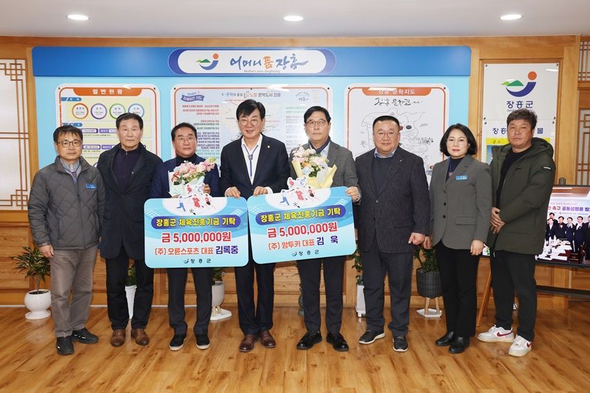 6일 장흥군에 따르면 ㈜오륜스포츠의 김록중 대표와 ㈜앙투카의 김욱 대표가 그 주인공이다. 두 기업인은 장흥군 체육진흥기금에 1,000만원, 장흥군 체육회 운영기금에 1,000만원을 기탁하며 지역 체육 발전에 힘을 보탰다.