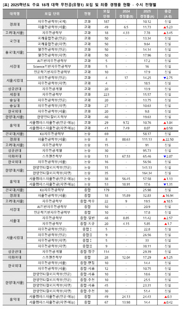 2025학년도 주요 18개 대학 수시 전형 무전공(유형1) 모집 및 최종 경쟁률 현황. 이투스 교육평가연구소 제공