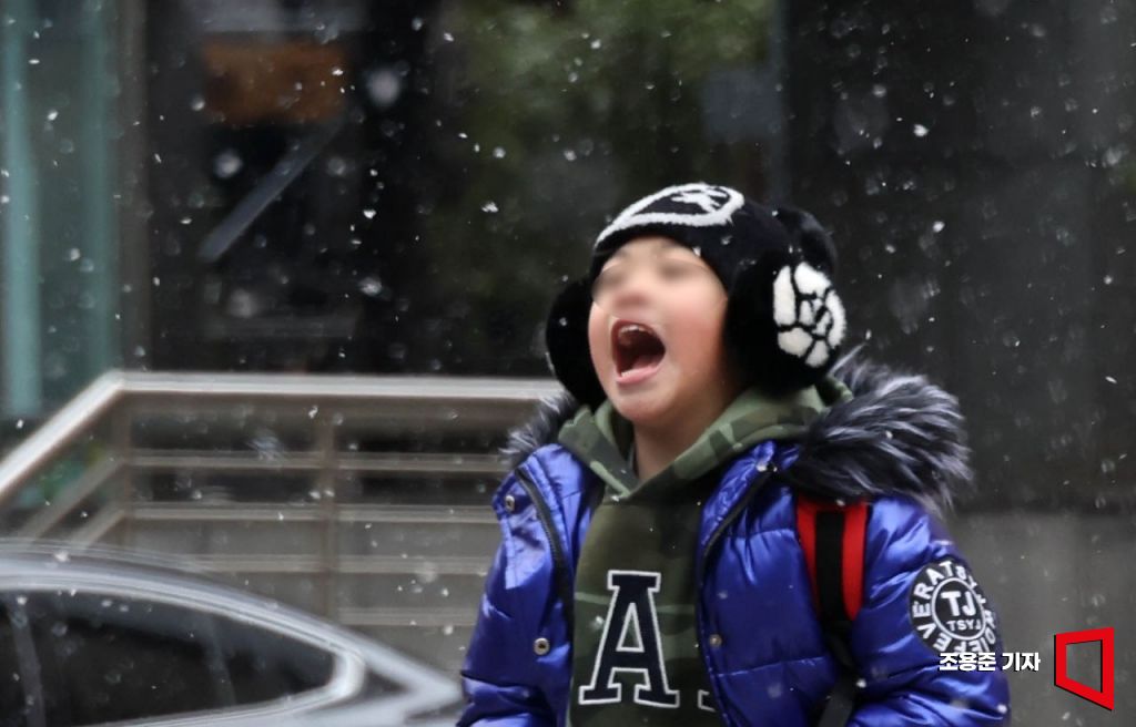 절기 입춘에 시작한 최강 한파가 나흘째 이어지고 있는 가운데 서울에도 눈이 내린 6일 오후 서울 마포의 한 도로에서 아이가 눈을 맞으며 걸어가고 있다.