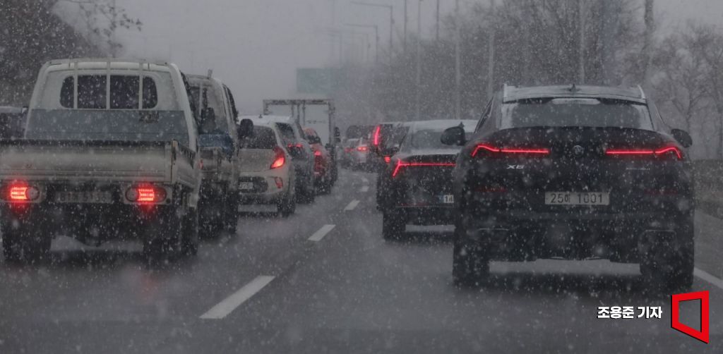 6일 서울에 많은 눈이 내리고 있는 가운데 서울 도심에 차량들이 거북이 걸음을 하고 있다.