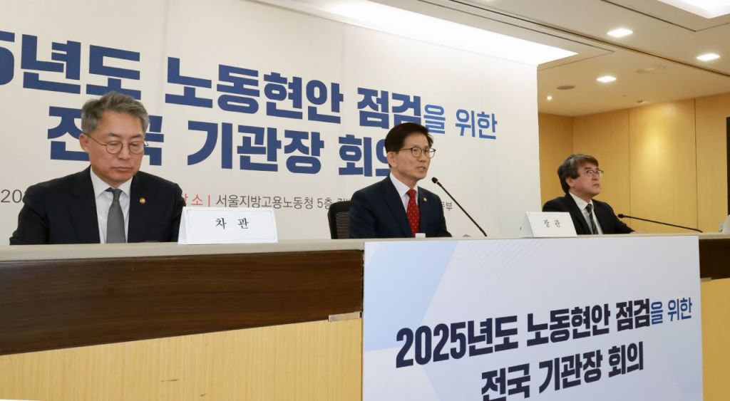 김문수 고용노동부 장관(가운데)이 설 연휴 직후 임금체불 감축과 통상임금 등 주요 노동 현안에 대한 논의를 위해 6일 서울지방고용노동청에서 올해 첫 '전국 기관장 회의'를 긴급 소집해 발언하는 모습. 고용노동부 제공