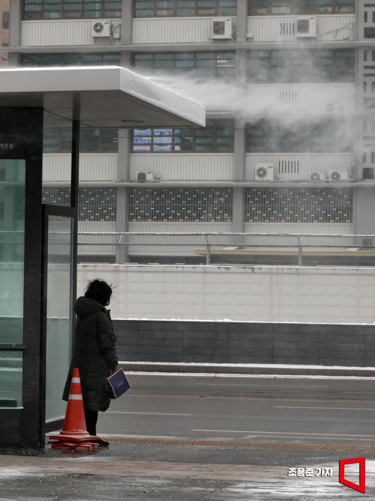 강추위와 함께 서울 지역에 많은 눈이 내린 7일 오전 서울 종로구 세종대로에서 눈보라가 일자 출근길 시민이 바람을 피하고 있다. 기상청은 이번주말까지 전국적으로 한파가 기승을 부릴것으로 예보했다.