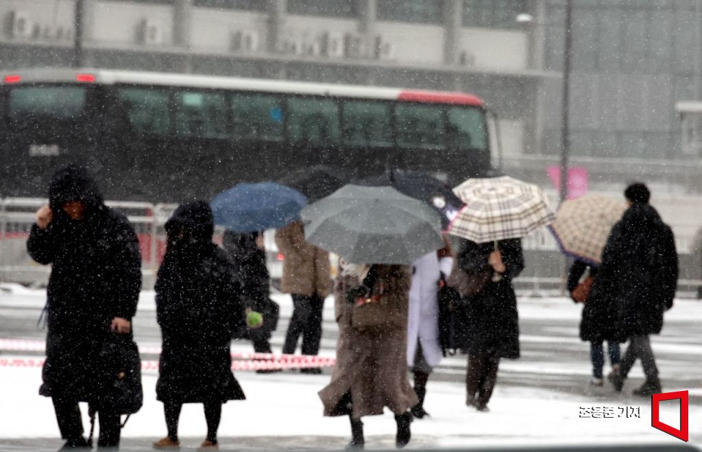 강추위와 함께 서울 지역에 많은 눈이 내린 7일 오전 서울 종로구 세종대로에 눈을 맞으며 출근길을 서두르고 있다. 기상청은 이번주말까지 전국적으로 한파가 기승을 부릴것으로 예보했다.