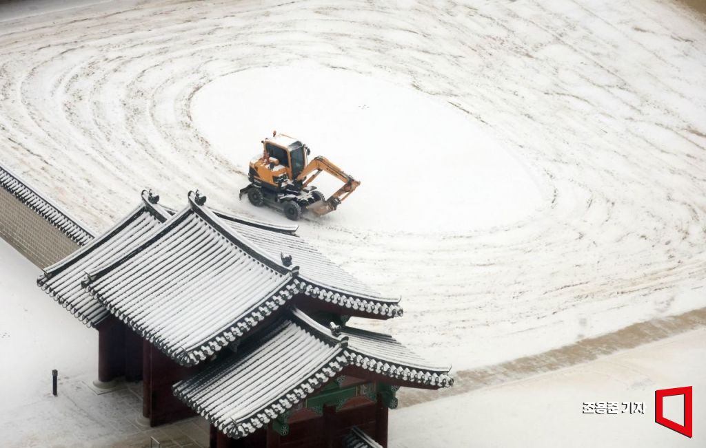 강추위와 함께 서울 지역에 많은 눈이 내린 가운데 7일 오전 서울 종로구 경복궁 관계자들이 제설작업을 하고 있다. 기상청은 이번주말까지 전국적으로 한파가 기승을 부릴것으로 예보했다.