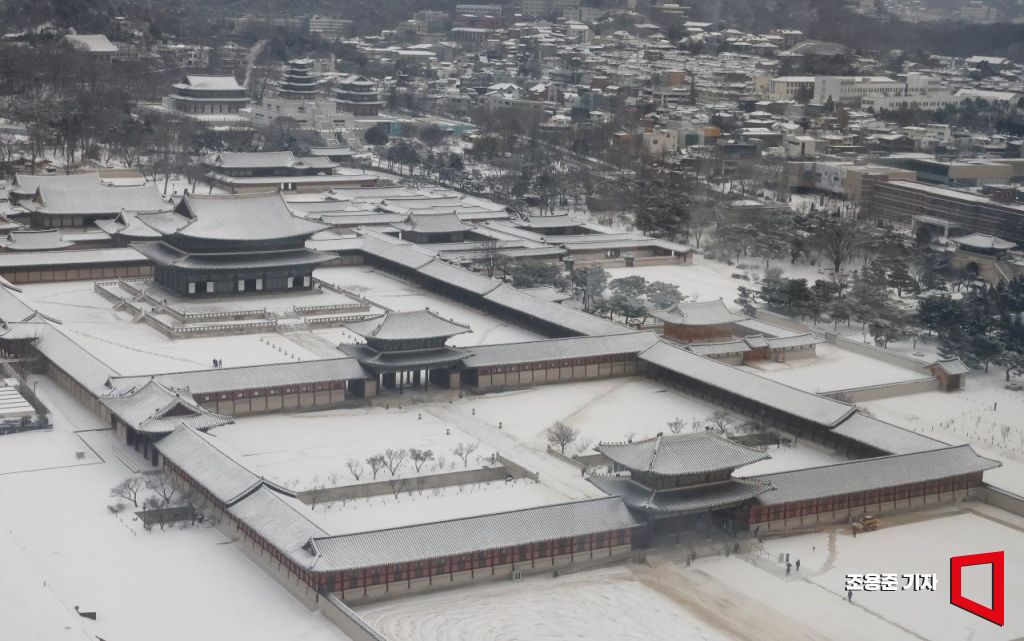 강추위와 함께 서울 지역에 많은 눈이 내린 가운데 7일 오전 서울 종로구 경복궁 일대가 눈으로 덮여 있다. 기상청은 이번주말까지 전국적으로 한파가 기승을 부릴것으로 예보했다.