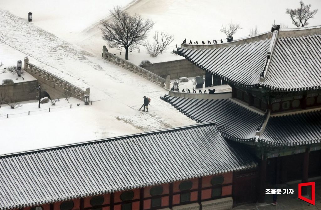 강추위와 함께 서울 지역에 많은 눈이 내린 가운데 7일 오전 서울 종로구 경복궁 관계자들이 제설작업을 하고 있다. 기상청은 이번주말까지 전국적으로 한파가 기승을 부릴것으로 예보했다.