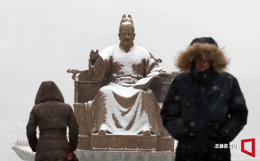 강추위와 함께 전날 서울 지역에 많은 내린 가운데 7일 오전 서울 광화문 광장 세종대왕 동상에 눈이 덮여 있다. 기상청은 이번주말까지 전국적으로 한파가 기승을 부릴것으로 예보했다.