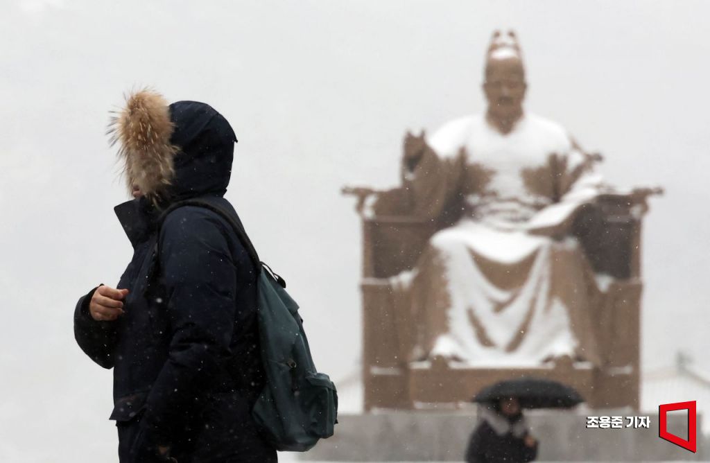 강추위와 함께 전날 서울 지역에 많은 내린 가운데 7일 오전 서울 광화문 광장 세종대왕 동상에 눈이 덮여 있다. 기상청은 이번주말까지 전국적으로 한파가 기승을 부릴것으로 예보했다.