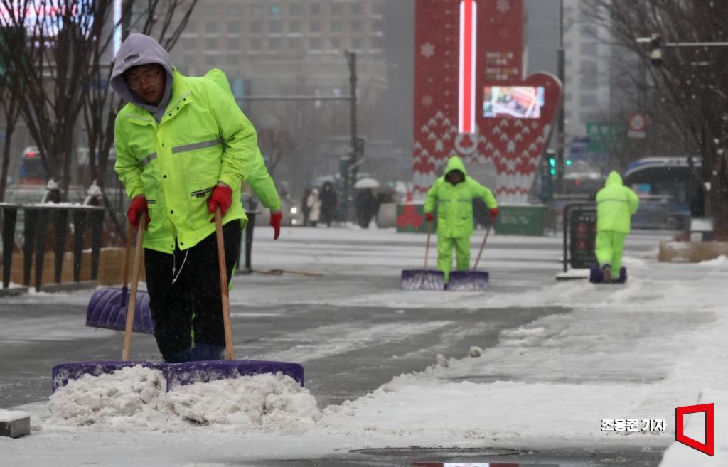 강추위와 함께 서울 지역에 많은 눈이 내린 가운데 7일 오전 서울 종로구 광화문광장에서 구청직원들이 제설작업을 하고 있다. 기상청은 이번주말까지 전국적으로 한파가 기승을 부릴것으로 예보했다.