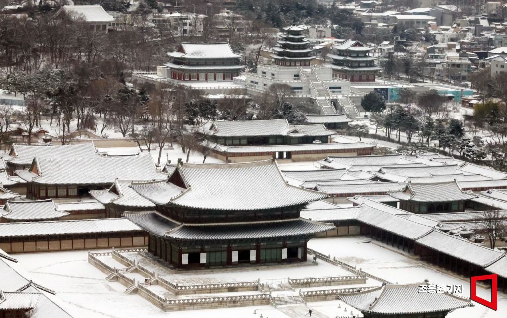 강추위와 함께 서울 지역에 많은 눈이 내린 가운데 7일 오전 서울 종로구 경복궁 일대가 눈으로 덮여 있다. 기상청은 이번주말까지 전국적으로 한파가 기승을 부릴것으로 예보했다.