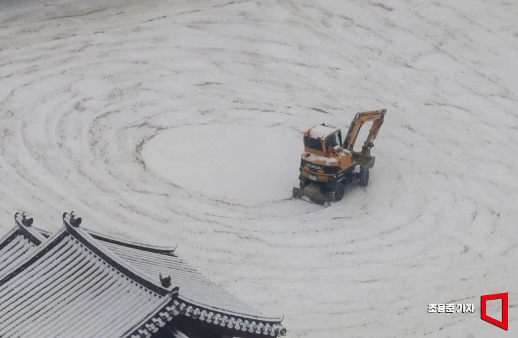 강추위와 함께 서울 지역에 많은 눈이 내린 가운데 7일 오전 서울 종로구 경복궁 관계자들이 제설작업을 하고 있다. 기상청은 이번주말까지 전국적으로 한파가 기승을 부릴것으로 예보했다.
