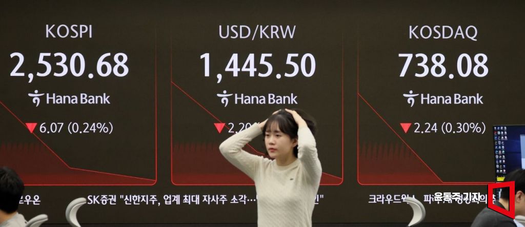 코스피 지수가 4거래일 만에 약보합세로 장을 시작한 7일 서울 중구 하나은행 딜링룸 현황판에 주가와 환율 지수가 표시되고 있다.