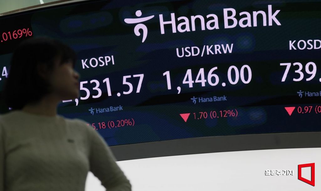 코스피 지수가 4거래일 만에 약보합세로 장을 시작한 7일 서울 중구 하나은행 딜링룸 현황판에 주가와 환율 지수가 표시되고 있다.