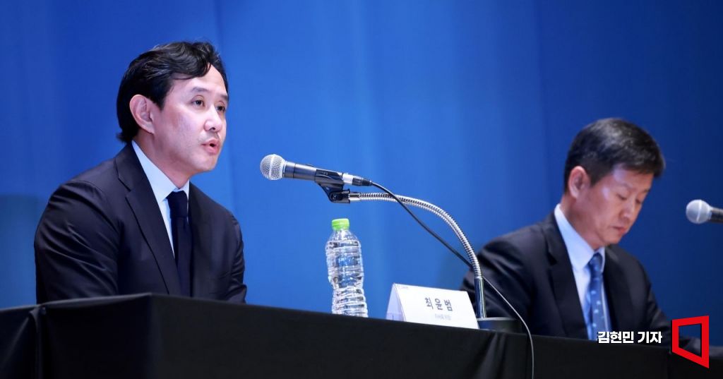 최윤범 고려아연 회장이 13일 서울 중구 대한상공회의소에서 열린 고려아연 기자회견에서 발언하고 있다. 오른쪽은 박기덕 대표이사. 최 회장은 이날 “최대한 빠른 시일 내에 이사회 의장직을 내려놓고, 사외이사가 고려아연 이사회 의장을 맡도록 하겠다”고 밝혔다. 김현민 기자