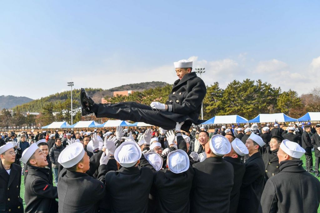 해군병 710기 수병들이 수료식을 마치고 수료를 축하하고 있다.