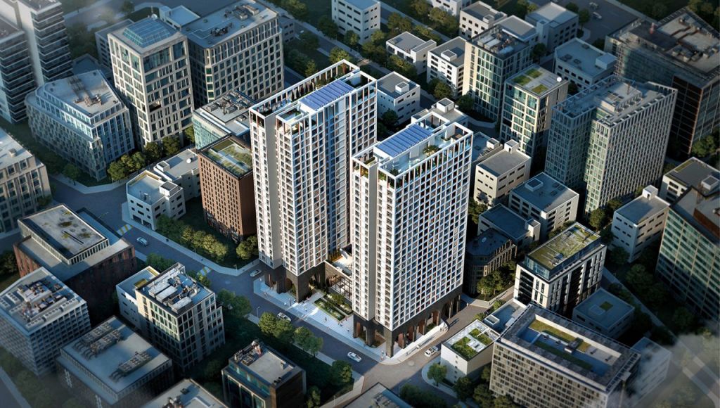 단지는 보행자와 주변 환경을 고려한 두 개의 타워로 나눈 설계가 특징이다. 1층은 8m 높이의 아치형 필로티 설계로 아치 아래 공간에 정원을 마련해 쾌적한 거리 환경을 제공한다.